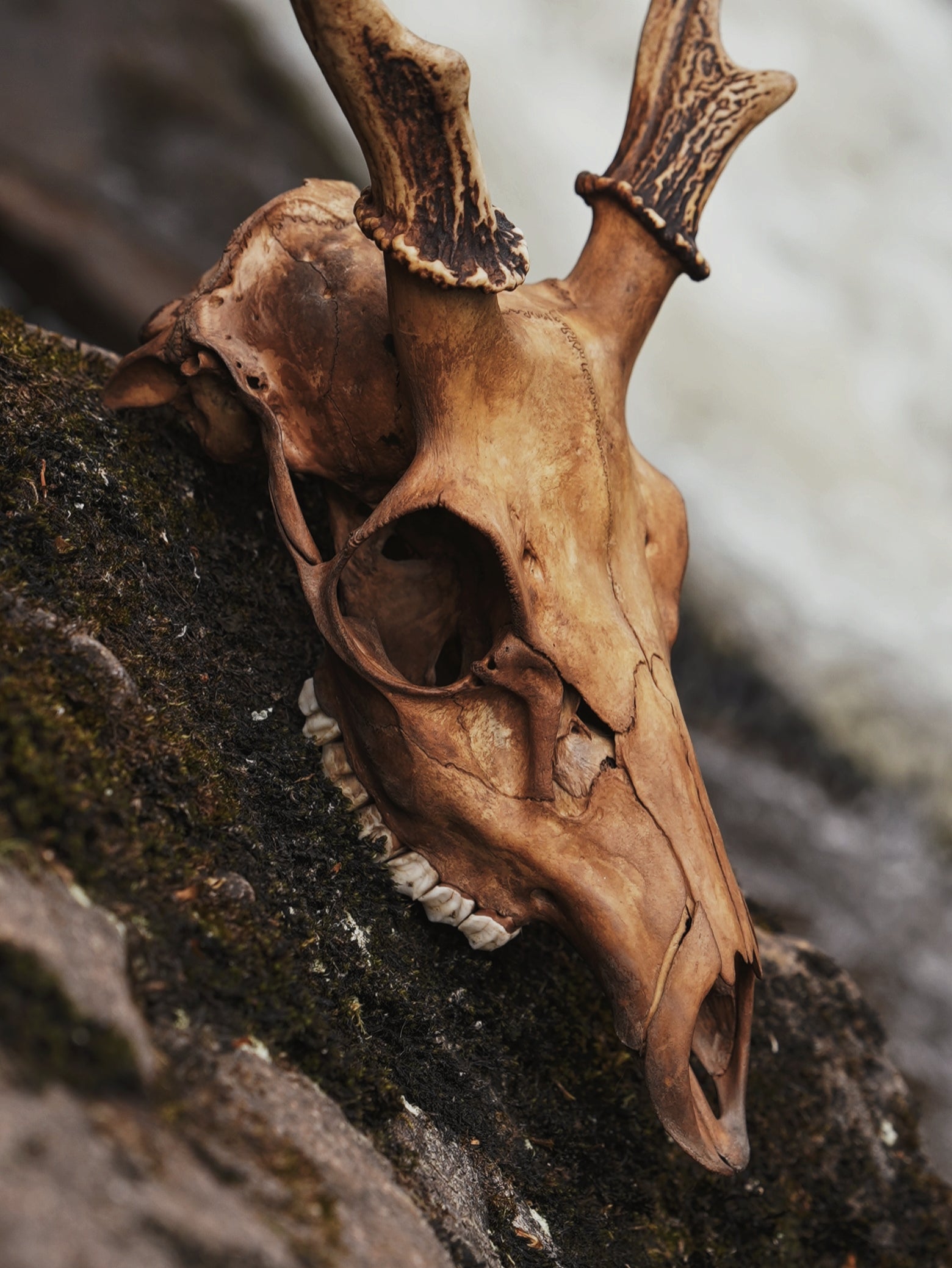 This sika stag was shot as part of a wider deer management plan, it has been cleaned via the process of natural decay and its skull has since been dyed naturally with the cones of the alder tree giving it a patina reminiscent of that seen in fossilisation. This is a beautiful piece of decor, ideal for any earthy space.